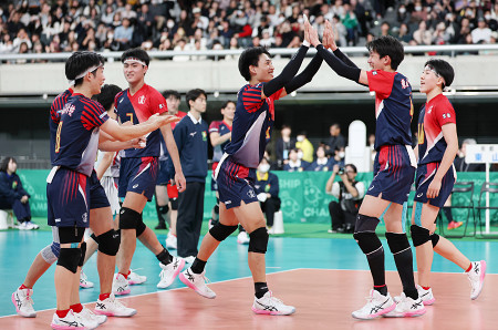 バレーボールの全日本高校選手権第5日は10日、東京体育館で準決勝が行われ、男子は清風(大阪)と東山(京都)が11日の決勝に進んだ。写真は雄物川に勝ち、喜ぶ東山の選手=10日、東京体育館 【時事通信社】