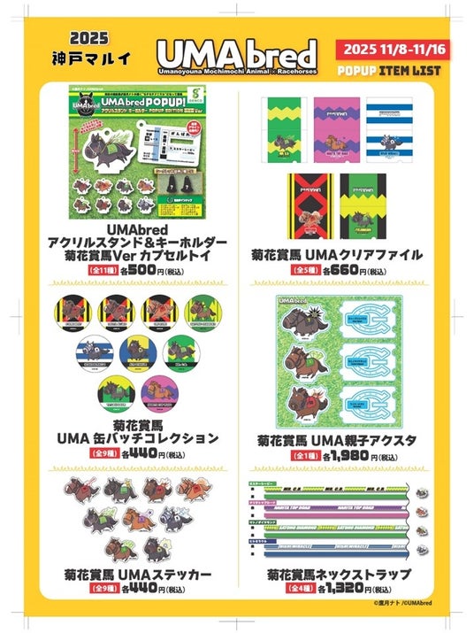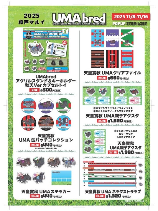 実在の競走馬・引退馬を「UMA」(ウマのようなモチモチアニマル)として描きおろすグッズブランド「UMAbred」は11/8(土)より神戸マルイにて秋以降の新規ラインナップグッズを扱うPOPUPを開催いたします。