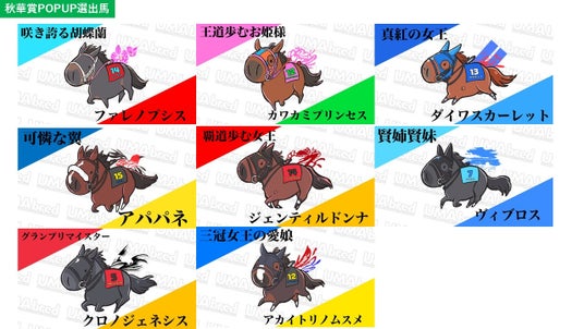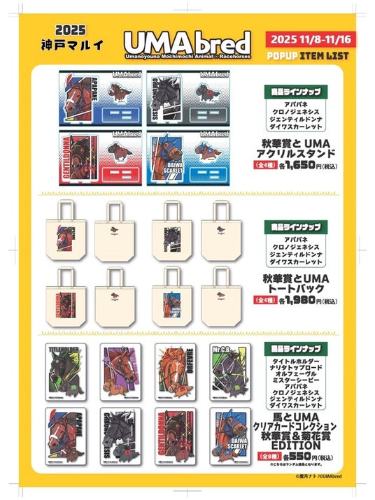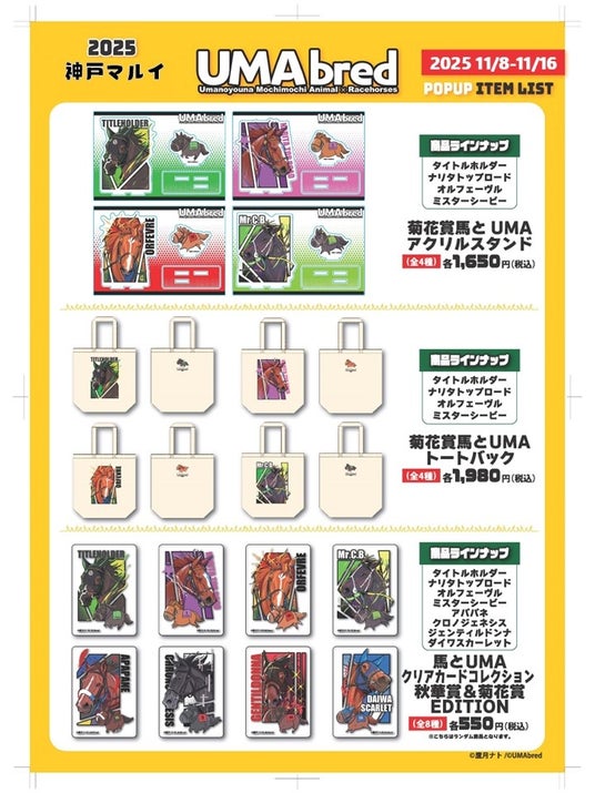 競走馬グッズブランド『UMAbred』が秋にリリースしたアイテムが関西初上陸!「秋華賞」「菊花賞」「天皇賞秋」「まんまるアイドルUMAシリーズ」が神戸マルイのPOPUPにて販売♪