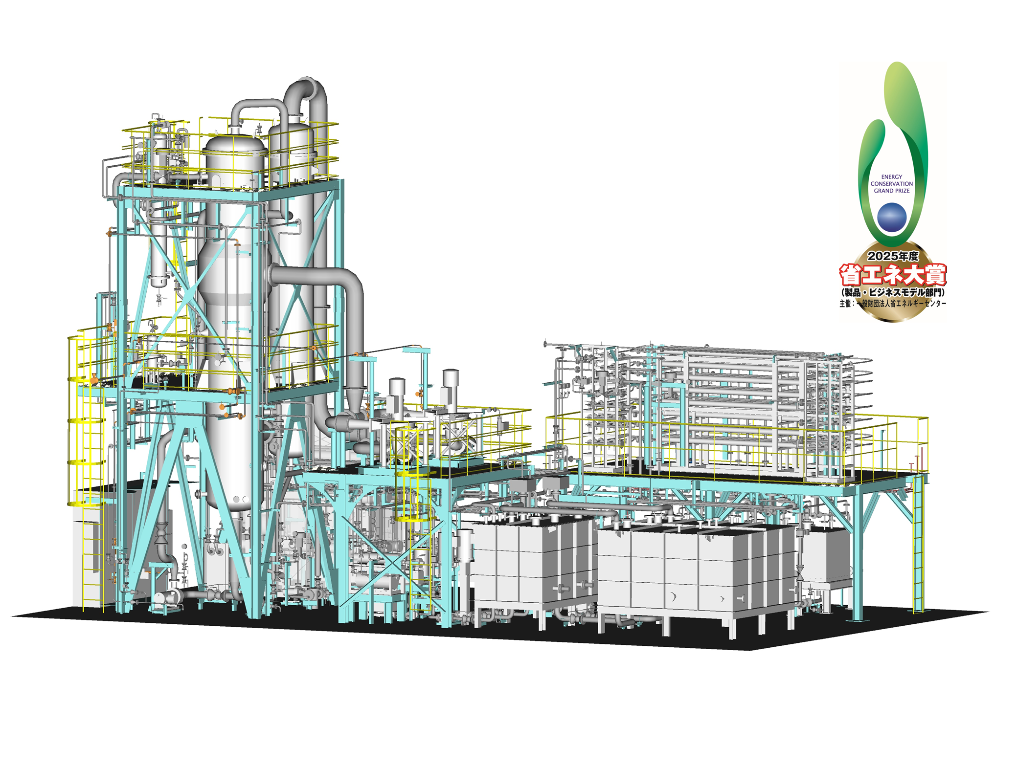 本装置は従来の蒸気式蒸留法と比べて、一次エネルギー使用量とCO2排出量を約8割削減可能であり、高い省エネ性と環境保全・省資源・リサイクル性への寄与が高く評価され受賞に至りました。省エネ大賞の受賞は、3年連続4度目(経済産業大臣賞は2度目)の受賞となります。