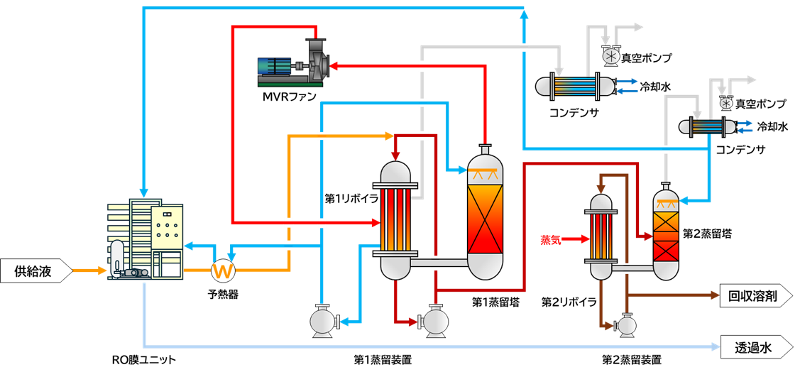 RO膜による前濃縮と凝縮水の処理に加え、沸点上昇によるMVRファンの負荷増を防ぐため、第1蒸留装置での抜出を中間濃度に抑え、高純度溶剤を回収する第2蒸留装置にあえて蒸気式を採用しました。これにより、これまでにない最高の省エネ性を達成することができました。