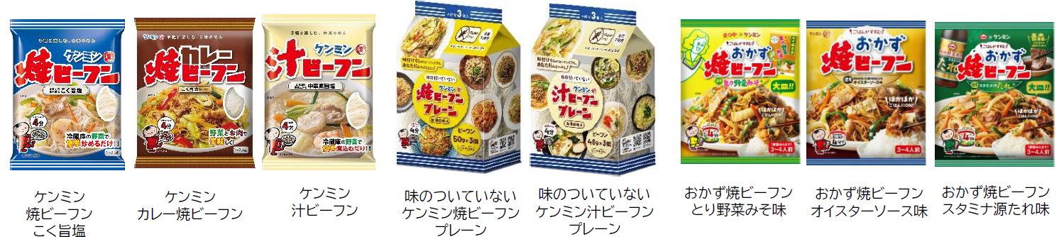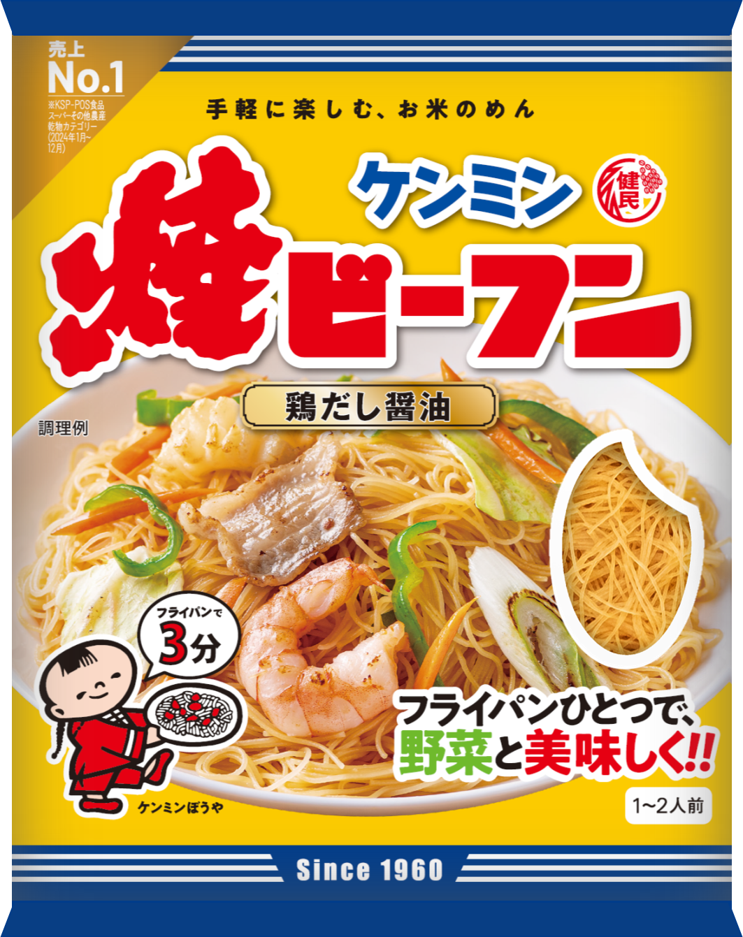 「ケンミン焼ビーフン」は、1960 年に誕生し、2020年に“最も長く販売されている即席焼ビーフンブランド”としてギネス世界記録(TM)にも認定されました。ビーフンを食べたことがない、作り方が分からない、作っても失敗するというお客さまの課題を解決 するため、鶏だしの効いた醤油味で味付けし、ゆで戻し・調味料不要で誰でも簡単に調理ができる商品として開発されました。野菜をたっぷり入れて美味しく食べられることや、フライパン1つで簡単に調理できる手軽さで、多くのお客さまから評価され、年間約1800万食を製造・販売しています。