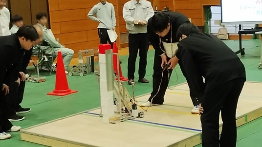課題研究で製作したリモコン式ロボットで、「令和7年度 ひょうご高校生ロボット競技大会2025 リモコン式ロボット競技」に参加しました。本校からは3チームが参加、優勝および3位・4位に入賞しました(写真は機械科のロボットの競技の様子)。