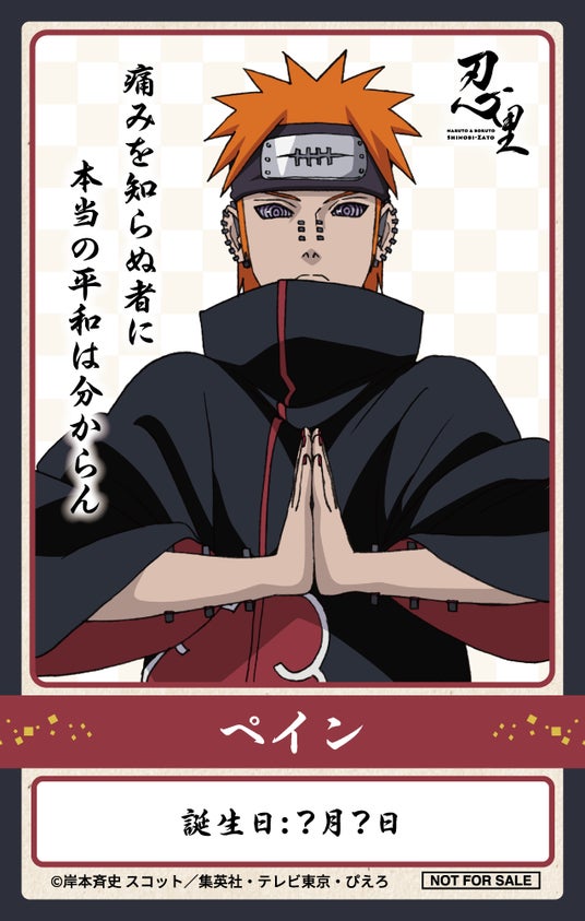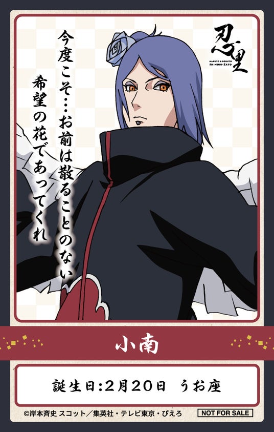 本イベントでは毎月、忍里限定の描き下ろしイラストを使用した、オリジナルバースデーステッカーをプレゼント。2月は、「猿飛ヒルゼン」「小南」「ペイン」「うちはオビト」をお祝いします!