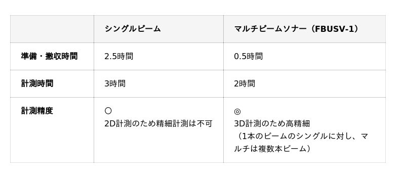 今回の実証実験では、計測前後の準備・撤去作業においても大幅な工数削減を実現し、計測中は測線に沿って自動航行を行うことで、艇体を操船することなく正確に計測できました。