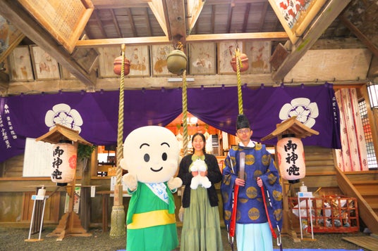 主祭神『須佐之男命(すさのおのみこと)』を祀る拝殿で、ぬいぐるみも参拝者の一員として丁寧にご祈祷を受けます。 敷地内には、巨大な「千年杉」がそびえ立ちます。静謐な空気の中で、日常を忘れてリフレッシュするひとときを過ごせます。ご祈祷後には、歴史ある境内での撮影会も実施。上郡町の人気ゆるキャラ「円心くん」が登場する特別な時間も用意されています。