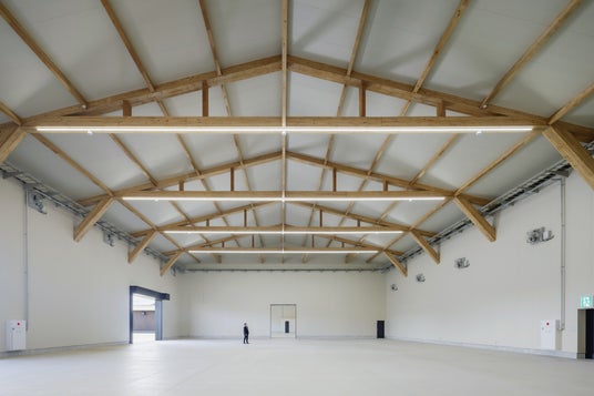 【営業用倉庫棟】約550坪、トラス工法による柱のない梁下約9mの開放的な空間。構造材は39cm角(万博の大屋根リングとほぼ同サイズ)。建築基準法に基づき、防火壁で二部屋に区画。再生可能エネルギーを使用して、"ゼロカーボン倉庫"を目指した運用を予定。
