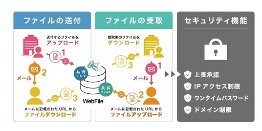 「WebFile」は、企業間の機密性の高いファイルの送受信とストレージ管理を簡易化するサービスです。