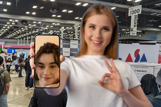 分身サービス「GENCHI」の ”出現” イメージ(遠方にいる依頼者が、現地の働き手のスマートフォンに顔を出現させ、擬似的にその場に存在することを再現。自宅やオフィスから、リアルタイムで展示会参加・交流ができます。)