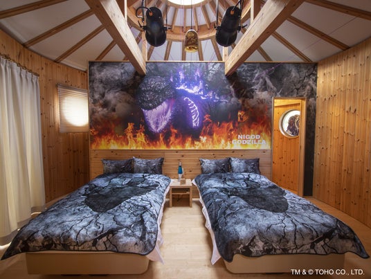 「GRAND CHARIOT 北斗七星135°」の一棟を、日本を代表する特撮映画「ゴジラ」をテーマに装飾。“昭和レトロ”をモチーフに、同作品の世界観と昭和時代が再現された空間を存分に楽しむことができる